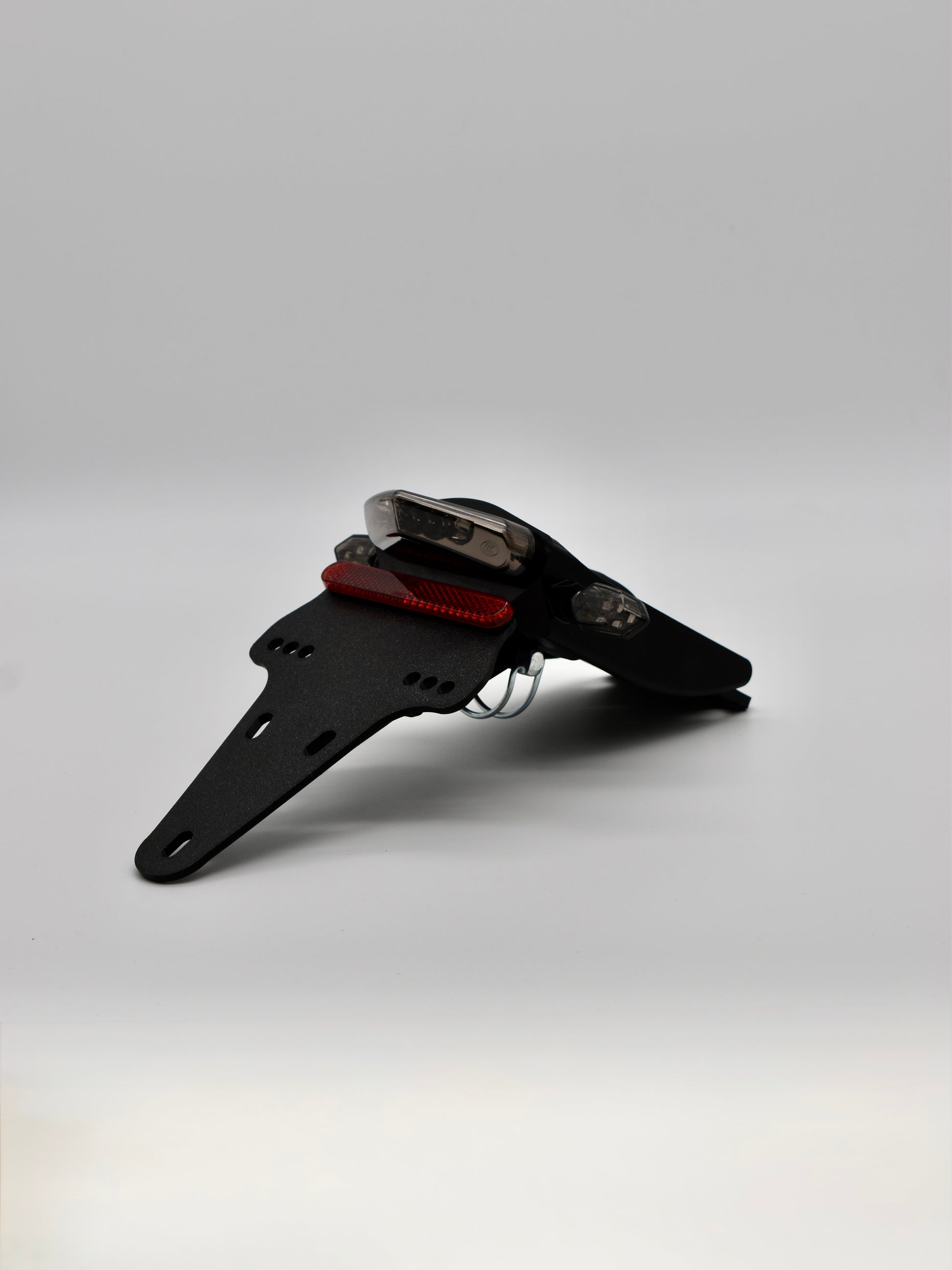 Wähle dein Motorradmodell aus und entscheide, ob du den Kennzeichenhalter mit integriertem Rücklicht (inkl. Kennzeichenbeleuchtung und E-Nummer) oder LED-Blinkern (E-Nummer) ergänzen möchtest.
