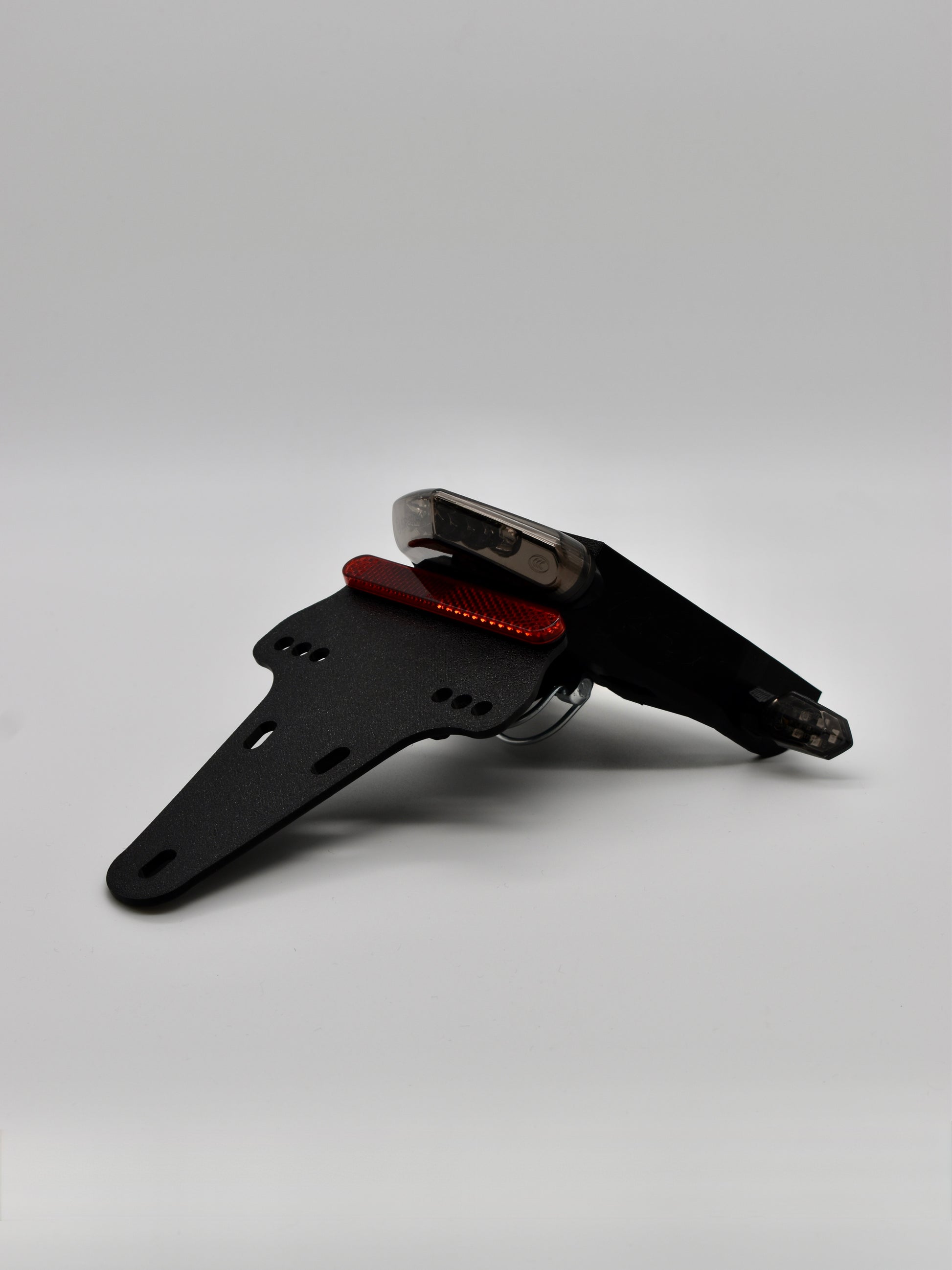 Wähle dein Motorradmodell aus und entscheide, ob du den Kennzeichenhalter mit integriertem Rücklicht (inkl. Kennzeichenbeleuchtung und E-Nummer) oder LED-Blinkern (E-Nummer) ergänzen möchtest.